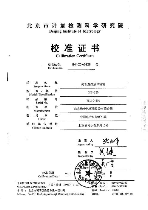 | >>高低溫濕熱試驗箱校準證書-北京計量院-中國電科院2 |