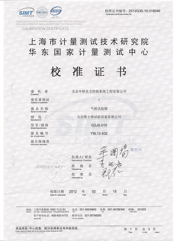 | >>氣候試驗(yàn)箱校準(zhǔn)證書-上海計(jì)量院-中核控制2 |