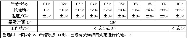恒溫恒濕試驗箱試樣在恒應(yīng)力狀態(tài)暴露期間,溫度變化應(yīng)十分緩慢以防止試樣損壞。用條件試驗方法11或12時,溫度變化階段應(yīng)保持最大的相對濕度,并在有關(guān)標(biāo)準(zhǔn)中說明試樣上是否允許出現(xiàn)凝露。恒溫恒濕試驗箱適用于航空航天產(chǎn)品、信息電子儀器儀表、材料、電工、電子產(chǎn)品、各種電子元氣件在高低溫或濕熱環(huán)境下、檢驗其各性能項指標(biāo)。 條件試驗10方法:低溫(下圖為條件試驗方法10低溫的嚴酷等級表)